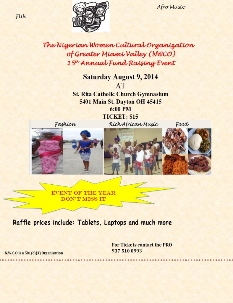 All is set for the 15th edition of the Nigerian Women Cultural Organization (NWCO) annual cultural event and fundraiser in Dayton Ohio. The family friendly event holds August 9, 2014 …